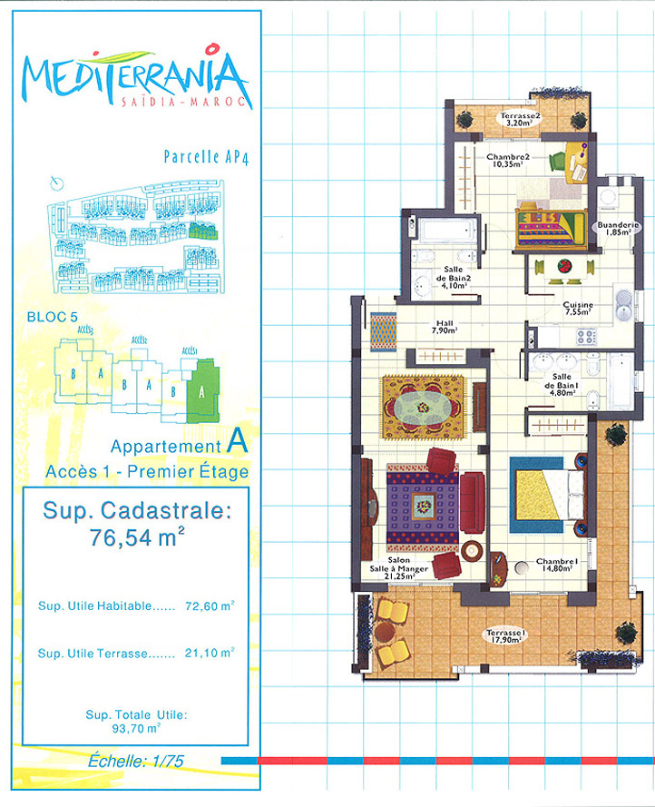 Este apartamento se encuentra ubicado en el primer piso de una nueva residencia dentro de la estación balnearia de Saidia, dispone de salón comedor, dos dormitorios y dos baños completos, cocina, lavadero y terraza.